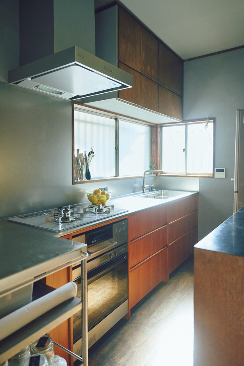 カウンタートップの素材には清潔感を重視してステンレスをセレクト。レトロな食器棚とのコントラストが素敵です。