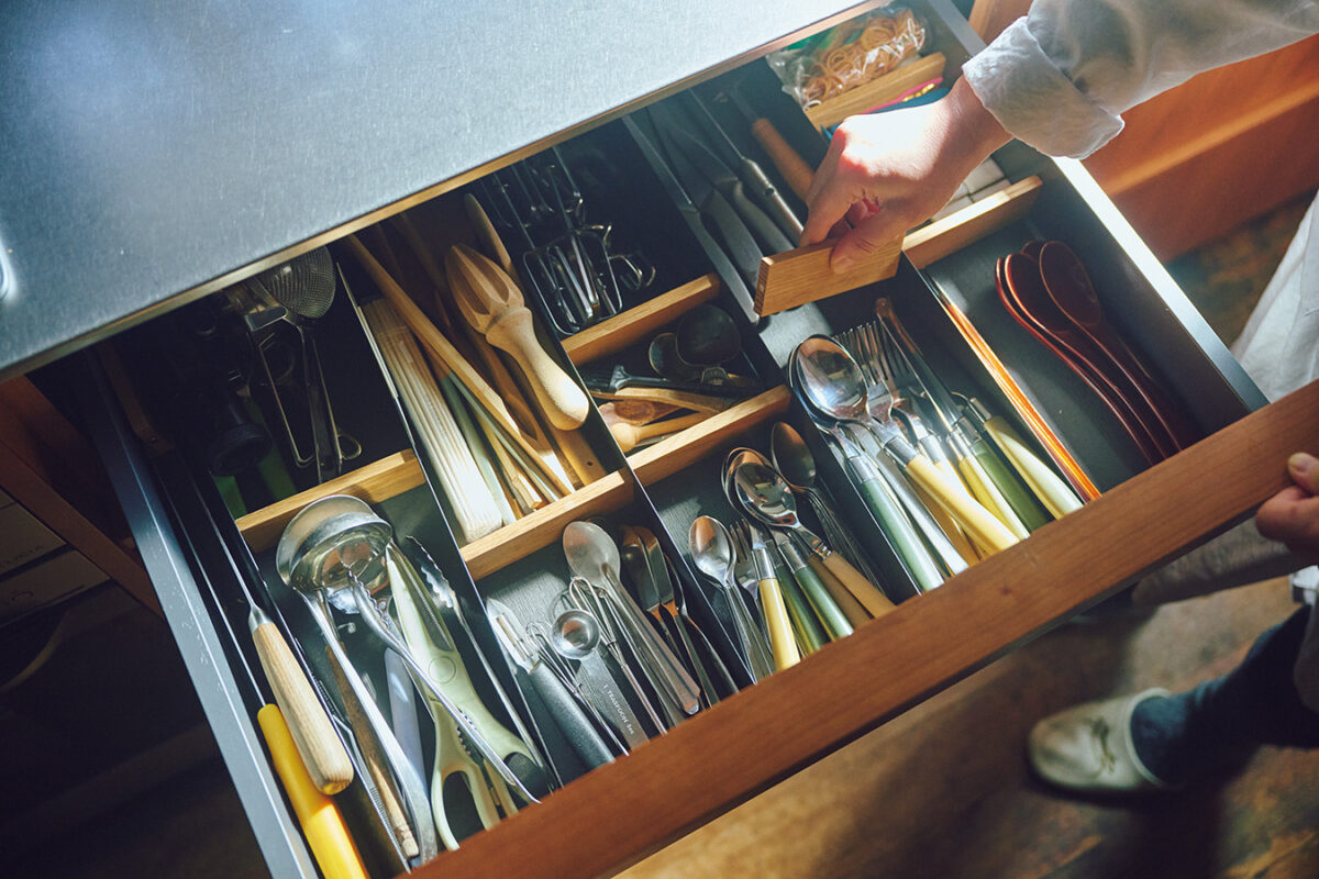 引き出しには、マグネット式の仕切りでレイアウトを変えて、あらゆるサイズのカトラリーを収納。