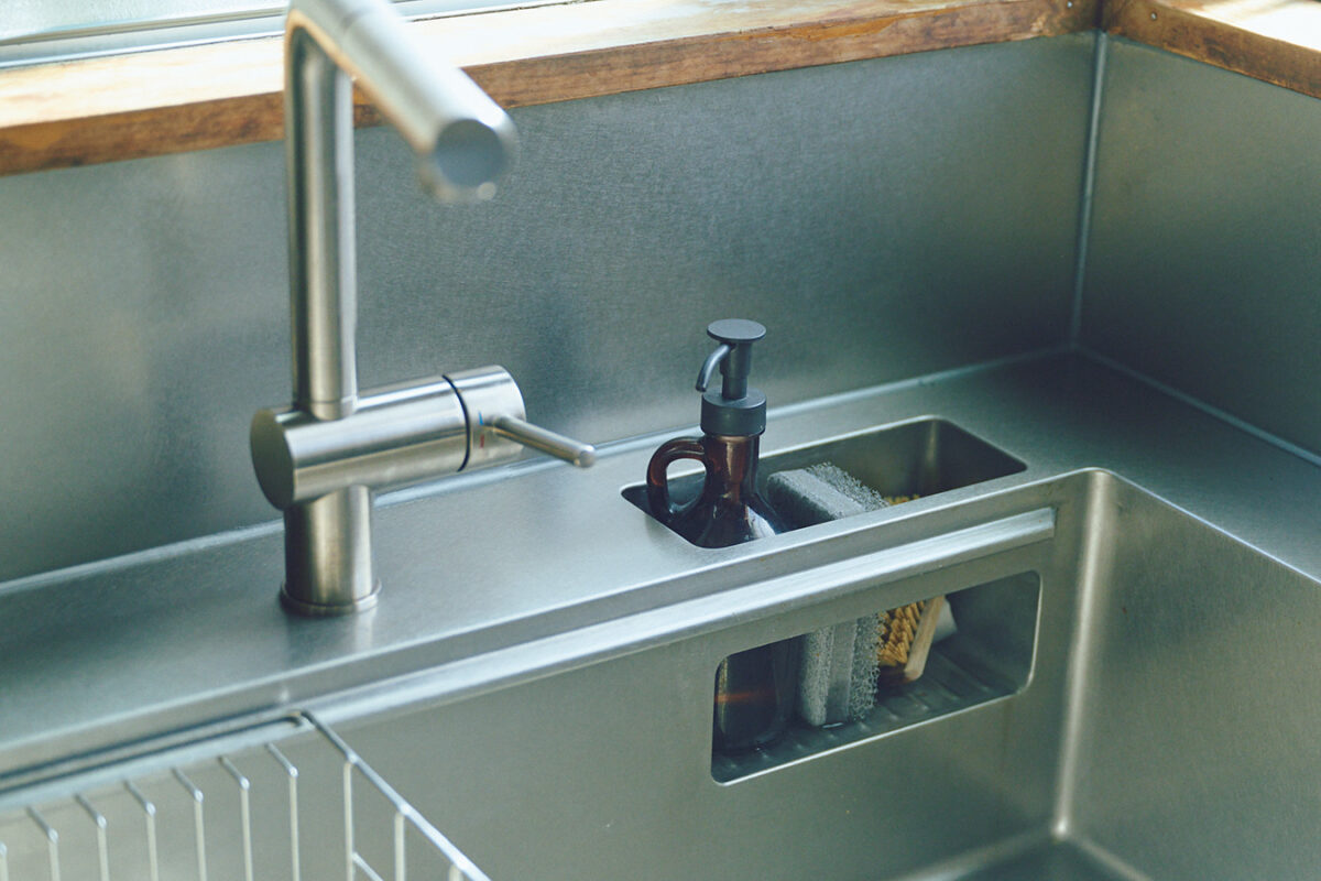 洗剤とスポンジが目立たない“隠しポケット”を備えたシンク。