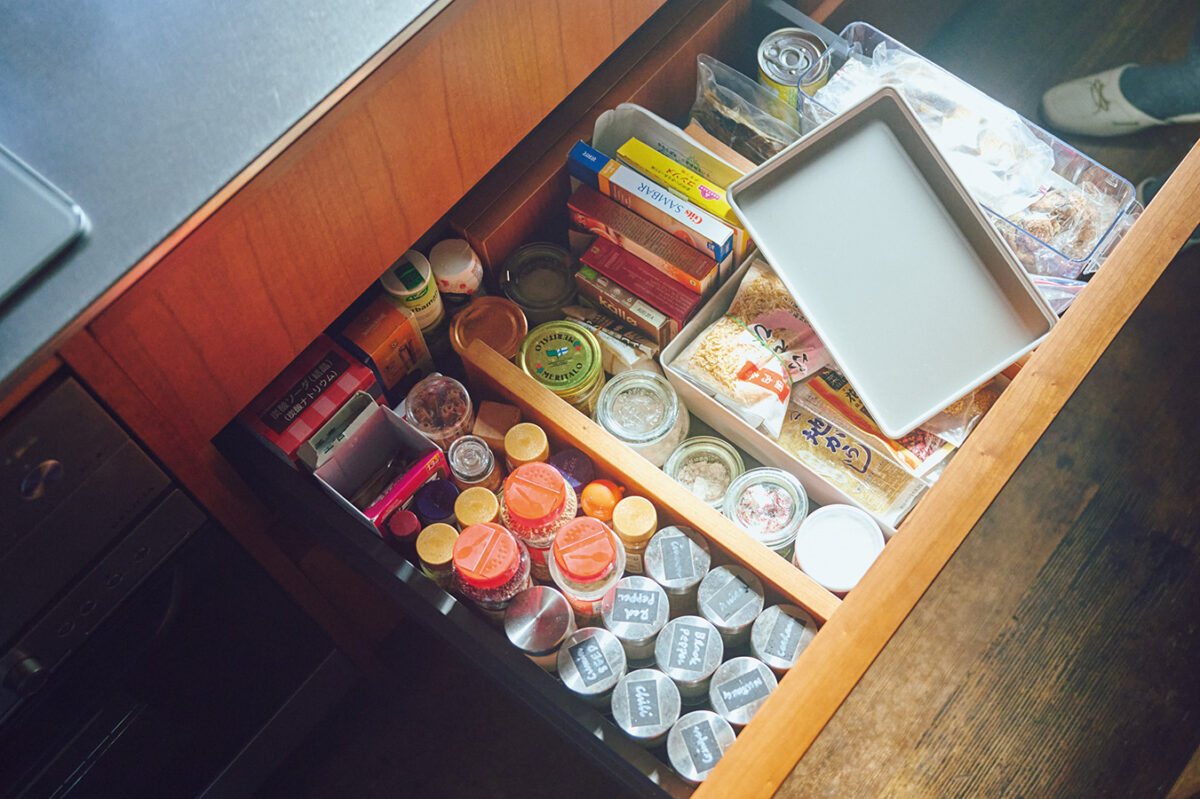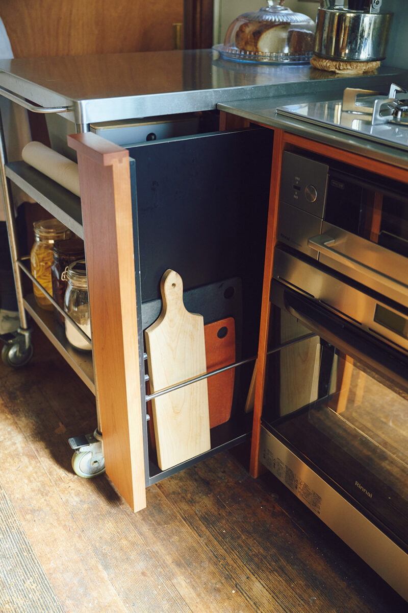 ガスオーブン脇の引き出しにはカッティングボードを収納。