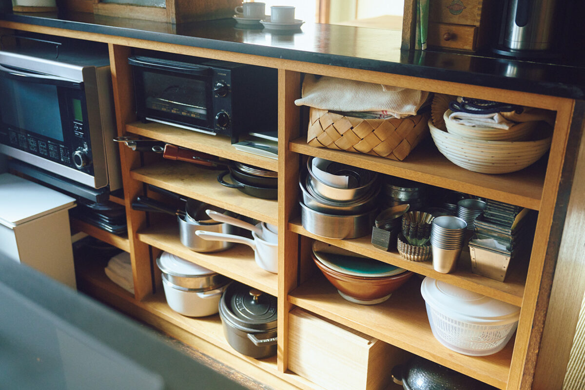 下半分には鍋類やお菓子作りの道具をしまっています。