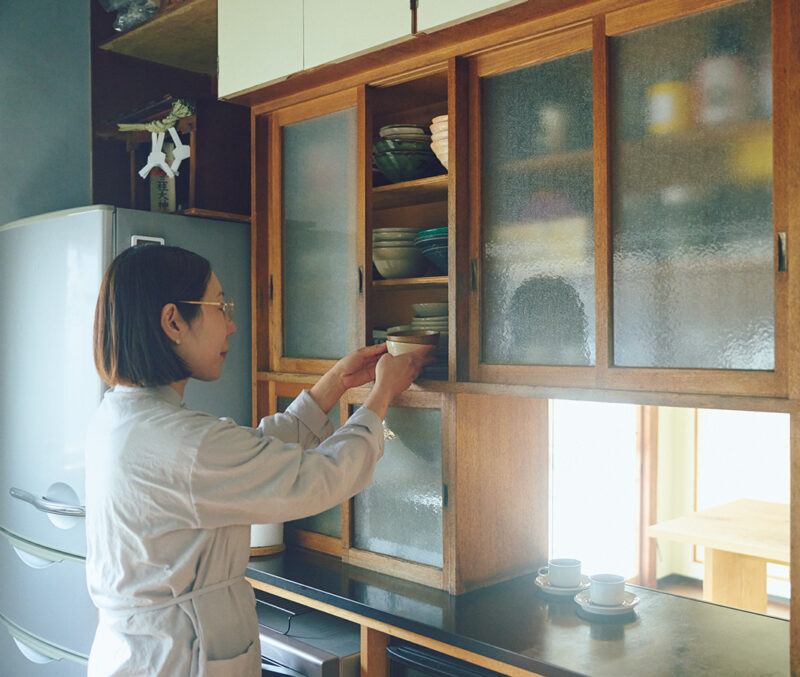 振り向けばすぐ届く食器棚。よく使うものは取り出しやすい位置へ。