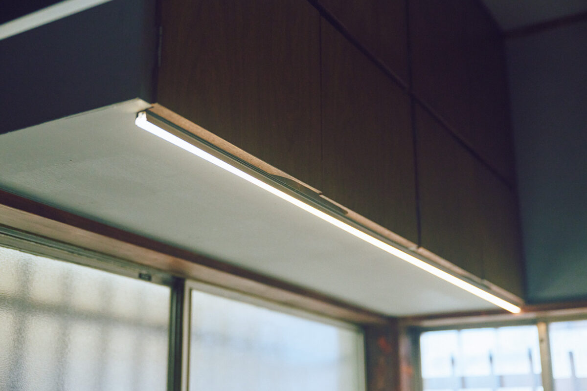 手元を照らすライトは一般的な蛍光灯のように目立つものを避け、吊り棚と一体化するデザインを採用。