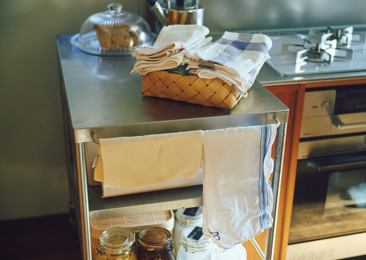 ふきん類は出しやすいようにカゴに入れ、使用中のものはワゴンの取っ手にかけています。