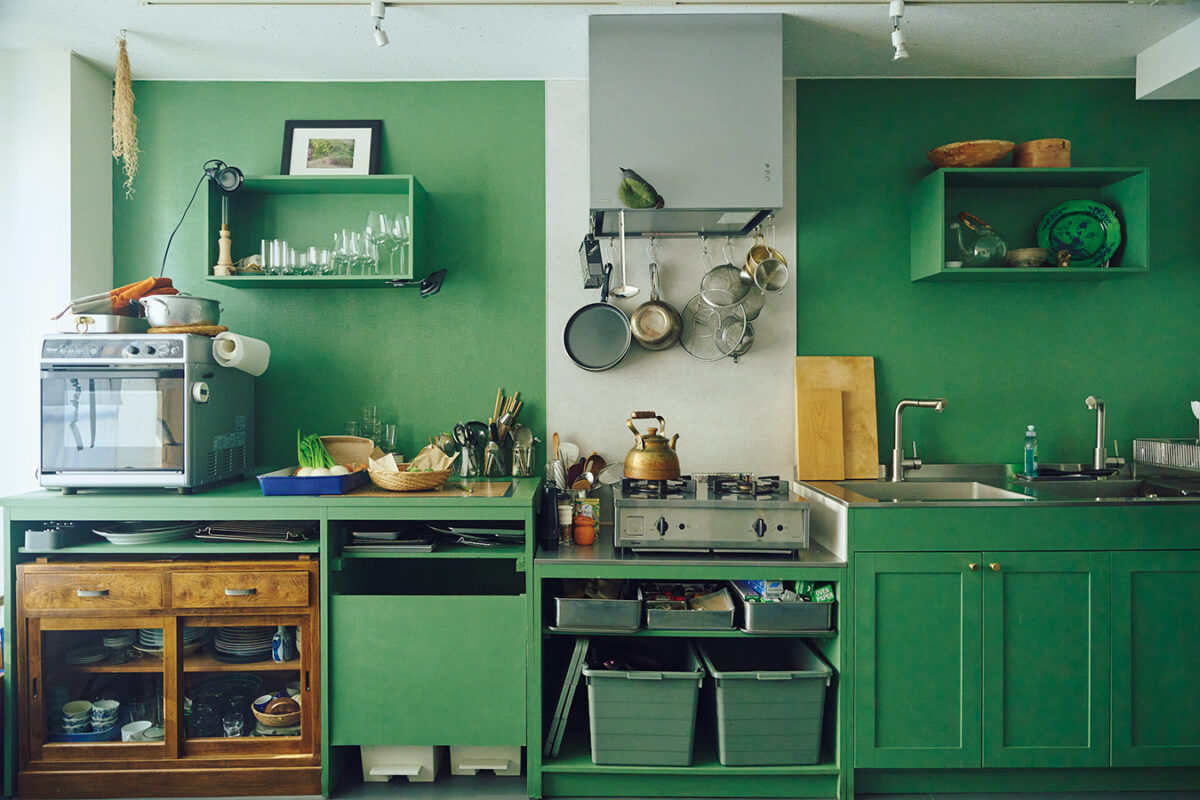「ツールボックス」のオーダーメイド、台の部分は大工さんが設計通りに切った木材を自分でペイントし、組み立ては再び大工さんにお願いするという、半分DIYで、費用を抑える工夫も。モスグリーンはパリのアパルトマン風。