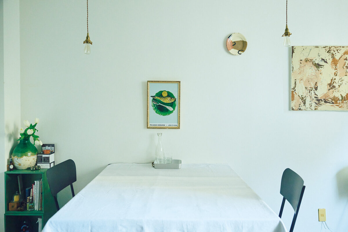 「ゴッホの壁紙のパーテーションを置こうと最初から考えていて。それに合わせて『ベンジャミンムーア』で塗料を選びました。キッチン側の壁は、壁紙の上から自分で塗ったんです」