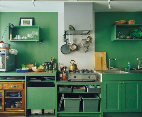 「ツールボックス」のオーダーメイド、台の部分は大工さんが設計通りに切った木材を自分でペイントし、組み立ては再び大工さんにお願いするという、半分DIYで、費用を抑える工夫も。モスグリーンはパリのアパルトマン風。