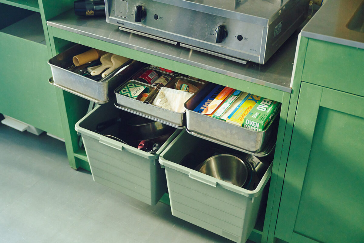 キッチンツールはステンレスの大きなバットに、鍋やフライパンはイケアのプラスチックケースに入れて前に引き出します。