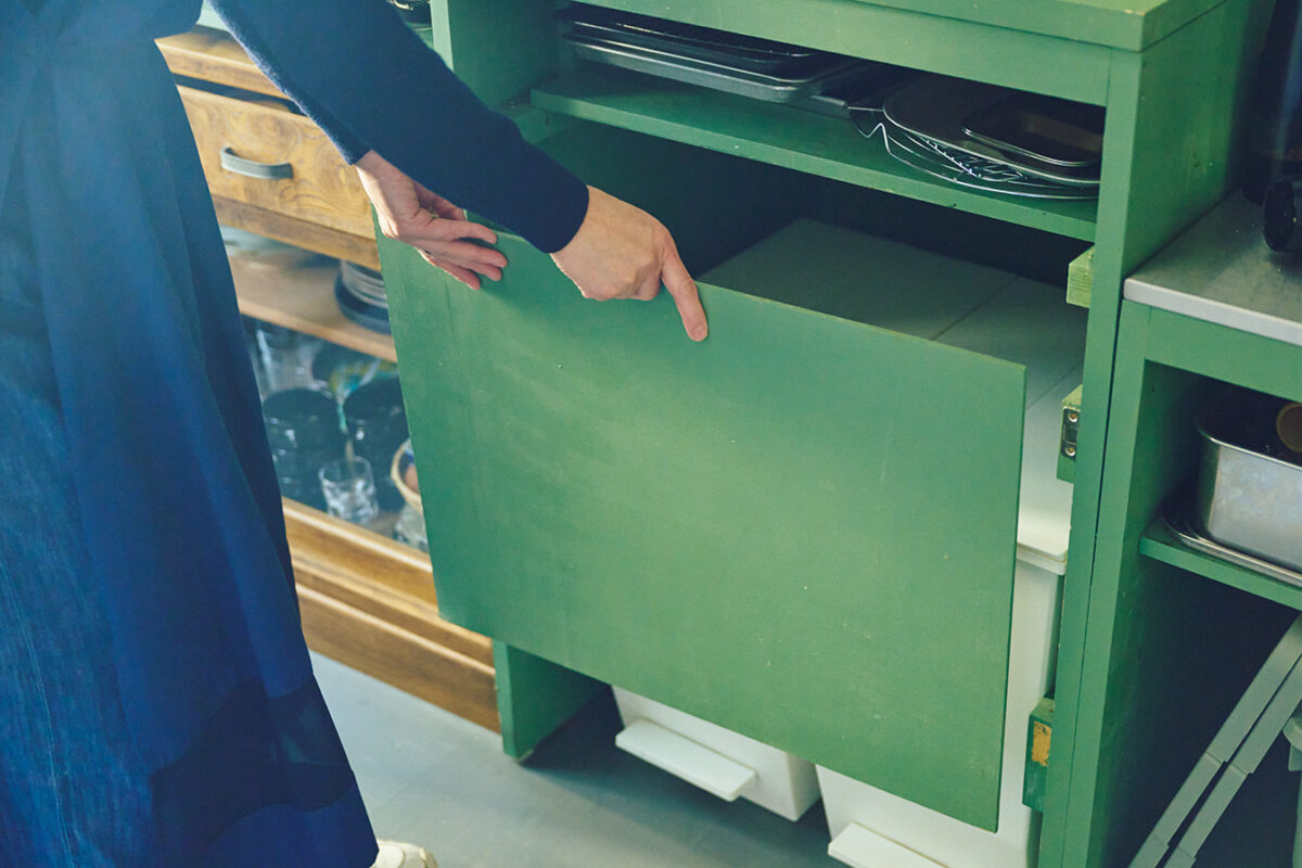 作業台の下にゴミ箱を置き、ペダルを踏める高さで目隠し板を取り付け。