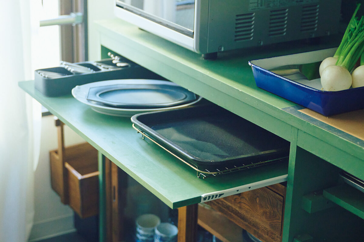 オーブンレンジの鉄板や大皿を置く棚板は、レールで前に引き出せる。これも自分で考えた工夫。