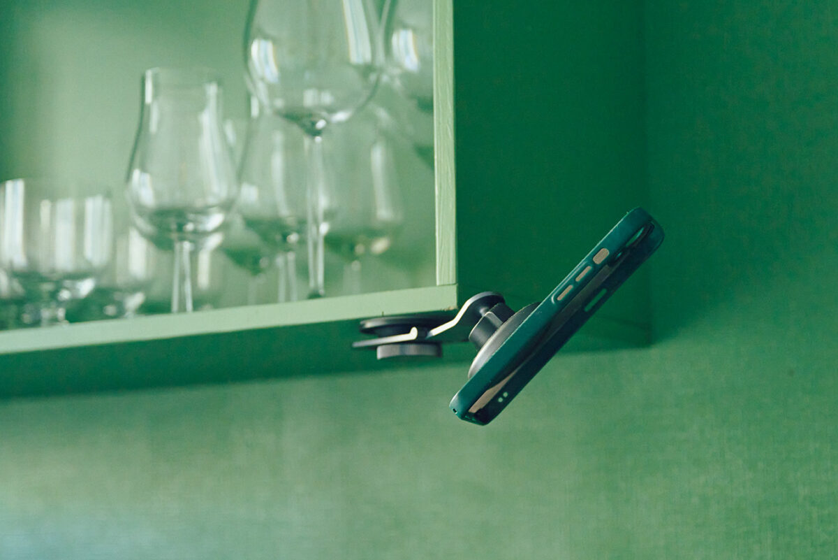 棚板に設置したスマホホルダー。動画撮影に便利。