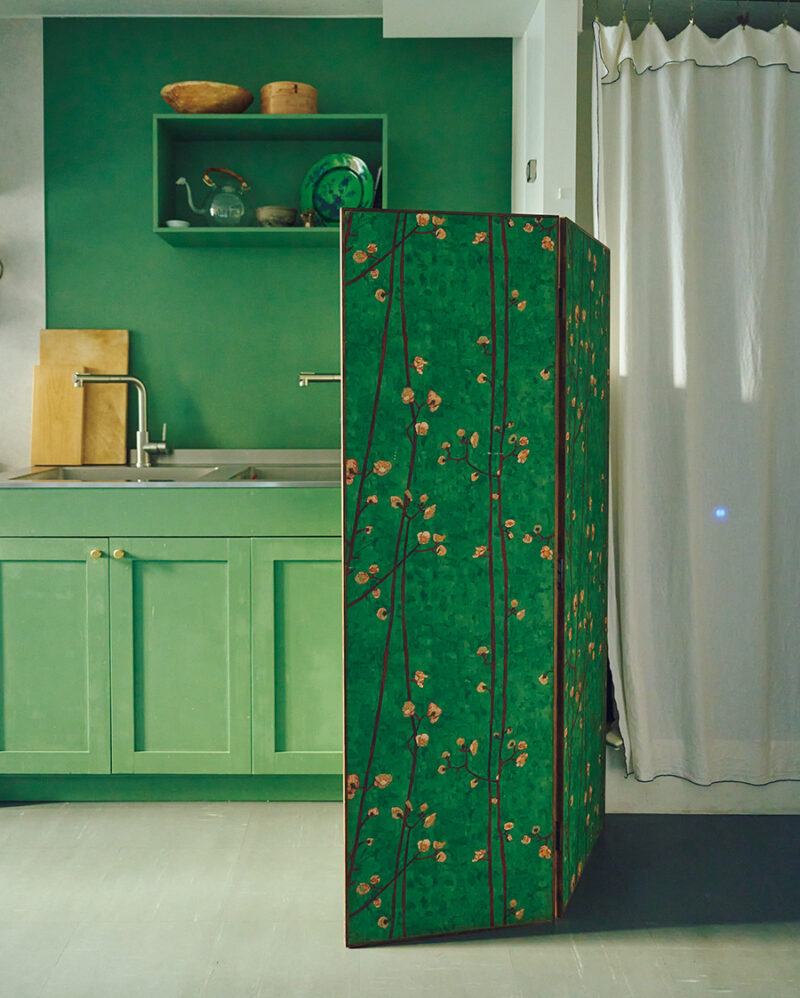 パーテーションは、ゴッホの「梅の木」の壁紙を自分で貼り付けたもの。