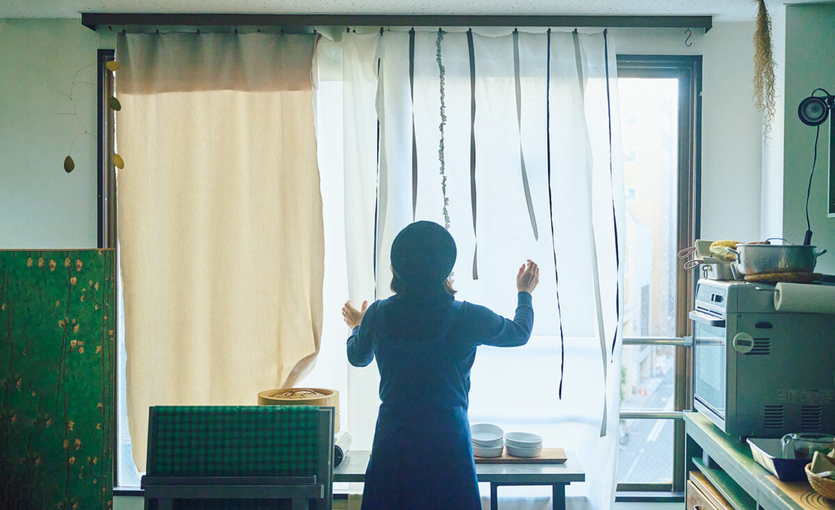 窓辺には、素材違いの布とリボンをランダムに下げてカーテン代わりに。