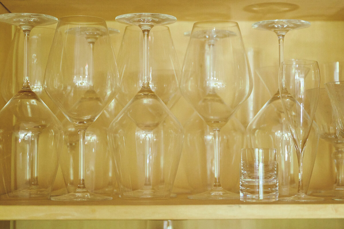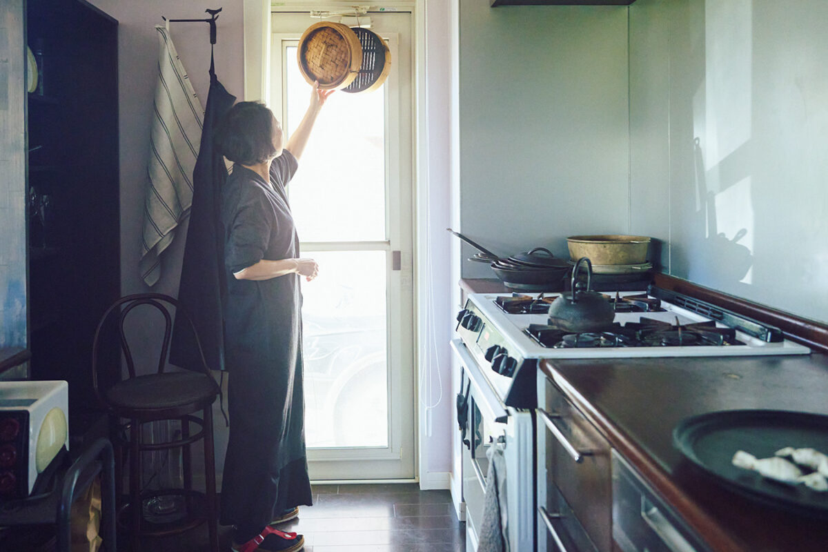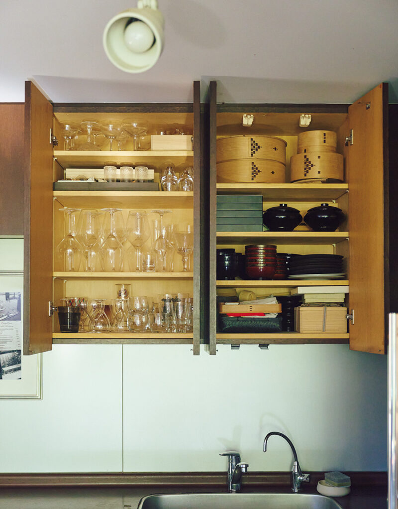 江川さん流の定位置の決め方は、素材で場所を分けること。シンク上の吊り棚はガラス類と漆器類(和食器)でグループ分け。