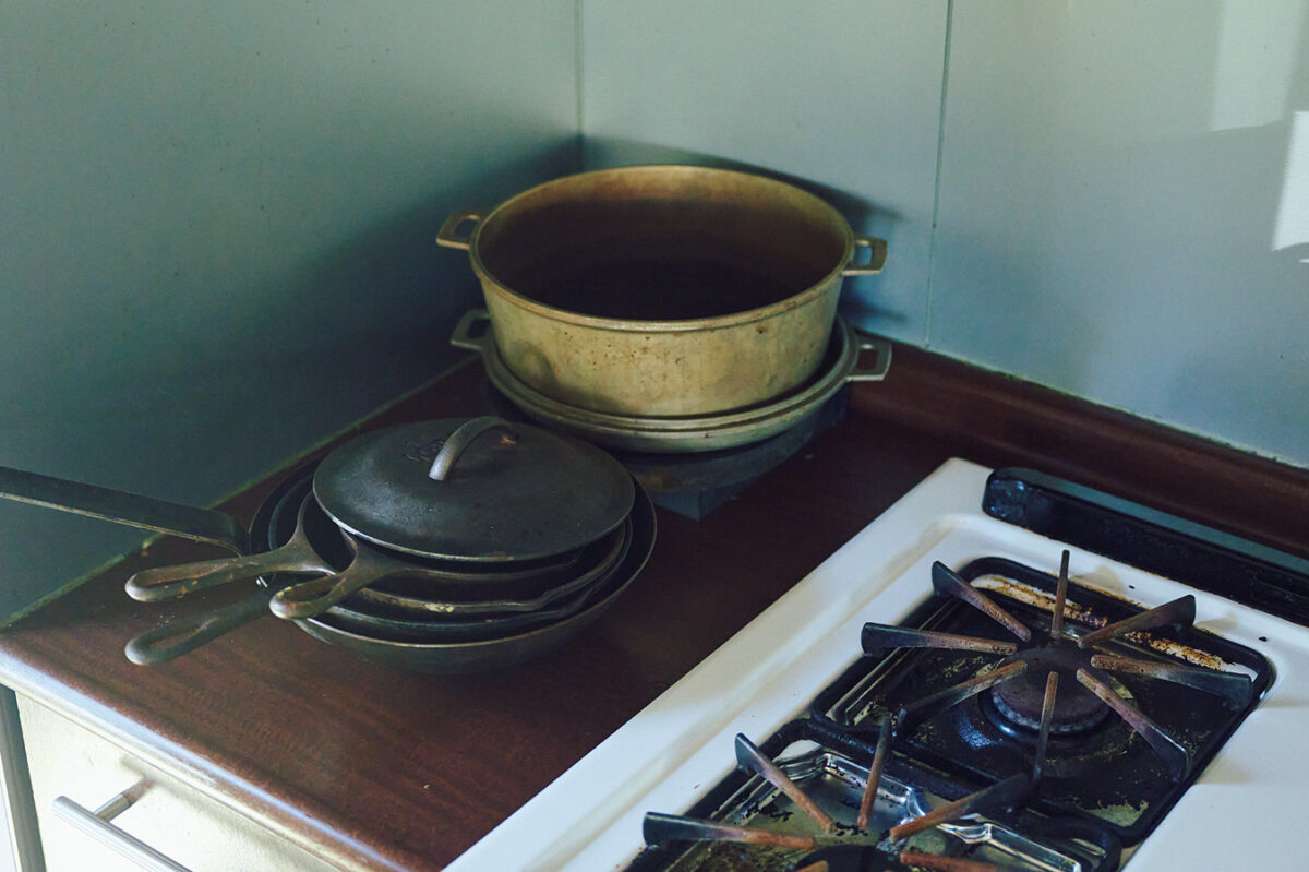 コンロの脇は、フライパン類を重ねて置くスペース。