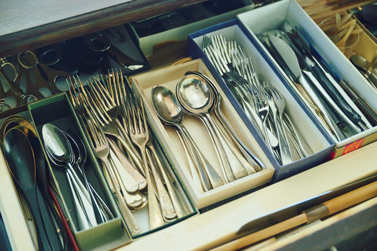 カトラリーの分類には、様々なサイズの空き箱をフル活用。