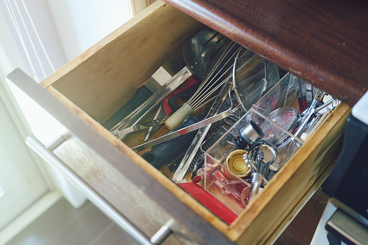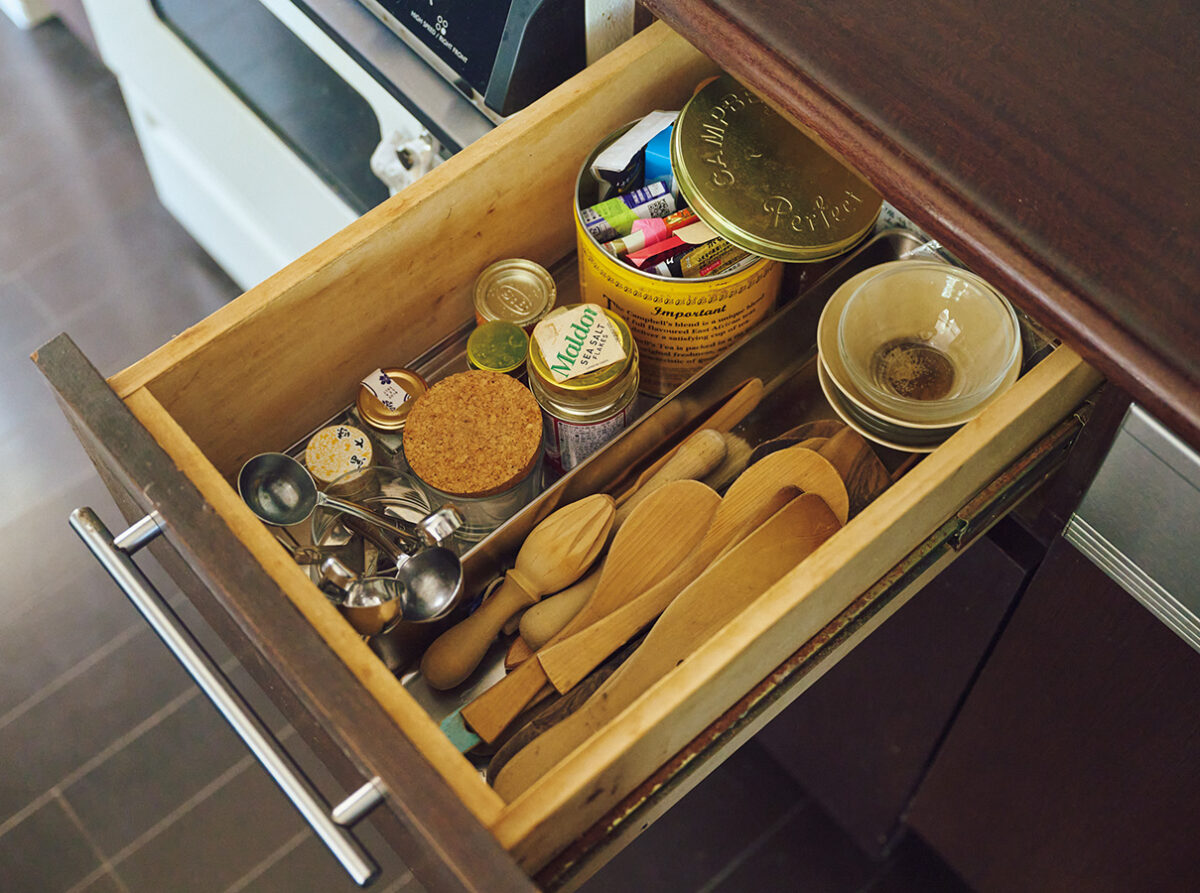 作業スペースの下にある一番手の届きやすい引き出しには木べら類を、よく使う調味料と一緒に置いています。