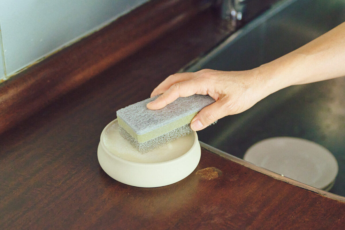 シンクまわりに出ているのは白い陶製のポットに入った食器洗い用石けんのみ(江川さんが開発中のオリジナル)。出しっぱなしでも絵になります。
