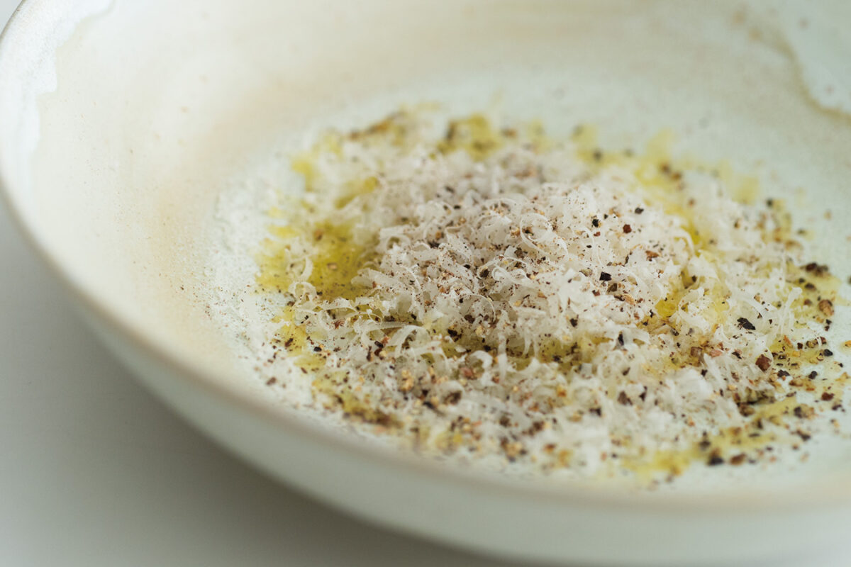2. パルミジャーノを削り、器に半量を敷く。オリーブオイル、黒こしょうのそれぞれ半量も、器に回しかける。