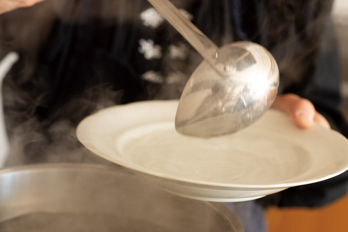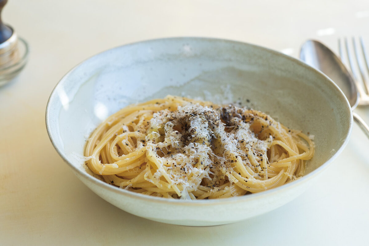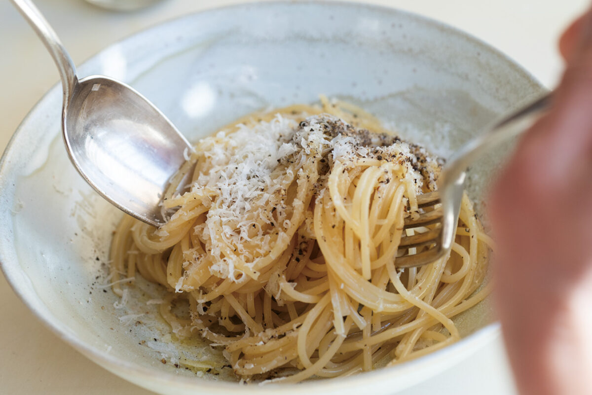 3. トングなどでゆで上がったパスタをつかみ、ゆで汁をきりすぎないようにそのまま2の器に盛り、残り半量のパルミジャーノ、オリーブオイル、黒こしょうと、粗塩を上にかける。熱いうちに混ぜながらいただく。