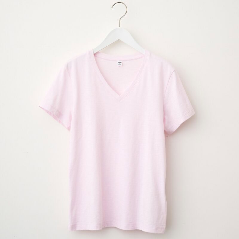 「Tシャツをはじめとするカットソーの衿元は、ここ数年ボートネックが主流でしたが、肩の力が抜けて見えながら、上品さを失わないきれい目スタイルに傾向が移っている今、カジュアルさが抑えられ、女性らしさもアップするVネックの衿元が増えています。このTシャツは衿のVラインが深すぎないので胸元が見えるのを気にせず着られる絶妙な開き具合。やや細身のシルエットなので、カジュアルになりすぎず大人っぽい印象で、イン&アウトに大活躍しそう。この季節欲しくなるカラーバリエーションも魅力です」