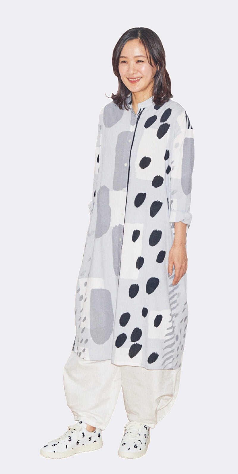 ボリューム感のあるパンツを合わせるのもポイント。「SO - SU-U」柄のスニーカーは白をチョイス。足元でぬけ感を演出。