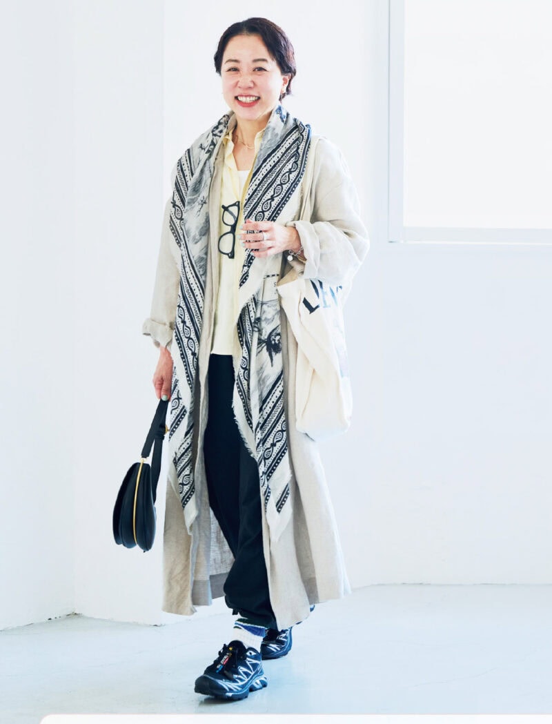 年に1度は自分を癒やす旅に出るという若狭さん。移動のスタイルは伸縮性があってラフ過ぎないパンツにシャツ、上質感のあるリネンコート。荷物はコンパクトに「ロエベ」のトートに収め、クラス感のある装いに。