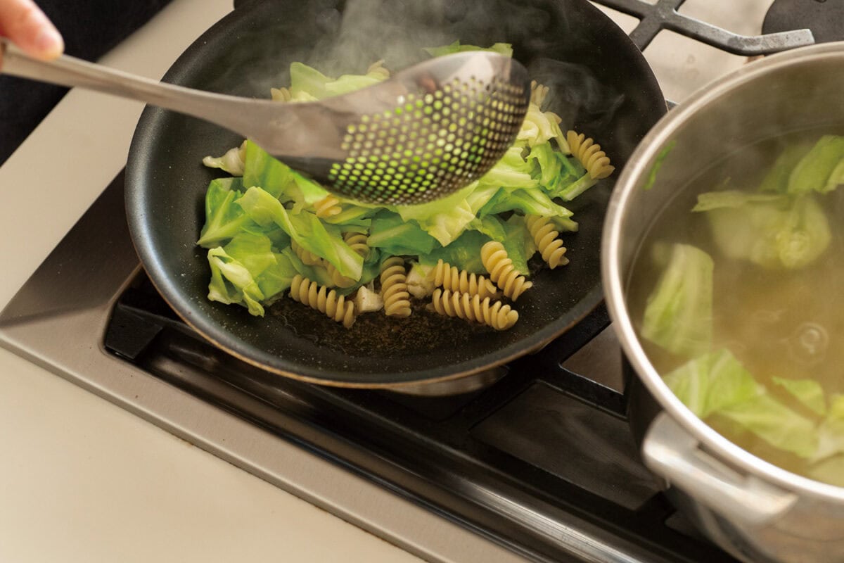 2. 鍋にたっぷりの湯(1. 5L ほど)を沸かして塩を入れ、パスタをゆで始める(表示より1分早めに上げる)。ゆで上がりの2 分前に、キャベツを加えて一緒にゆでる。器は温めておく。