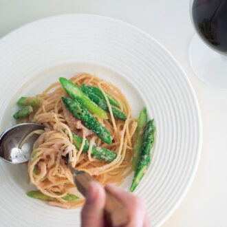 2. 鍋にたっぷりの湯(1.5L ほど)を沸かして塩を入れ、パスタをゆでる(表示より1分早めに上げる)。ゆで上がりの2 分前にアスパラガスを加え、一緒にゆでる。器は温めておく。