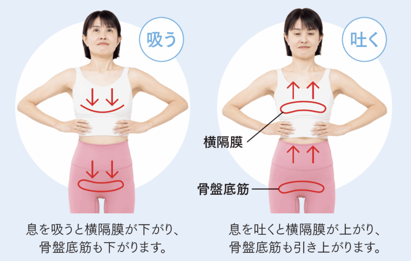 息を吸うと横隔膜が下がり、骨盤底筋も下がります。
