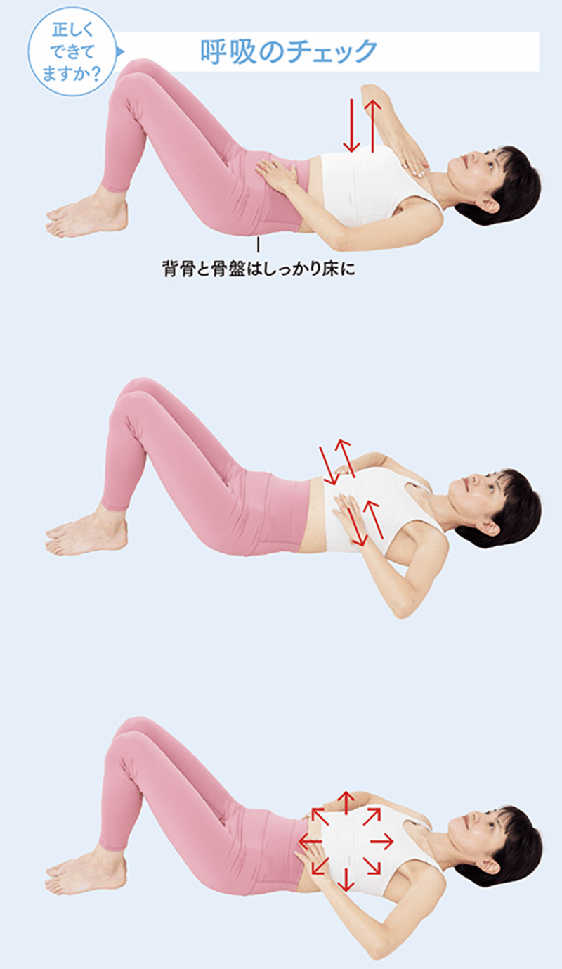 3. 息を吸ったときお腹とウエスト、背中など体全体が360度広がるのが理想。息を吐くと元に戻ります。お腹が動いていなかったり、お腹だけが動いていると骨盤底筋が使えていない可能性が。