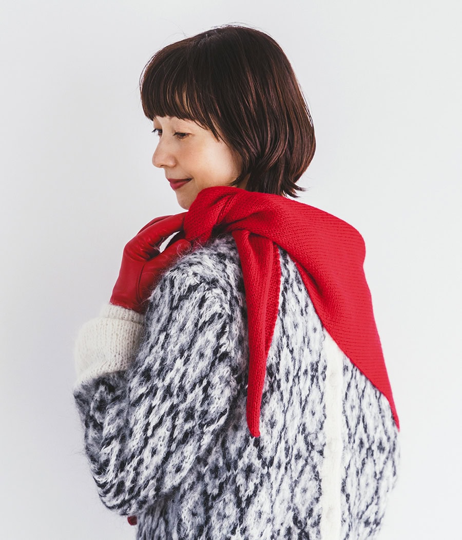 レザー手袋¥44,000/デンツ(真下商事)、三角ニットストール¥15,180/スチュワート オースティン(セムインターナショナル)、モヘヤセーター¥53,900/エリテ(ケイエムディーファーム)