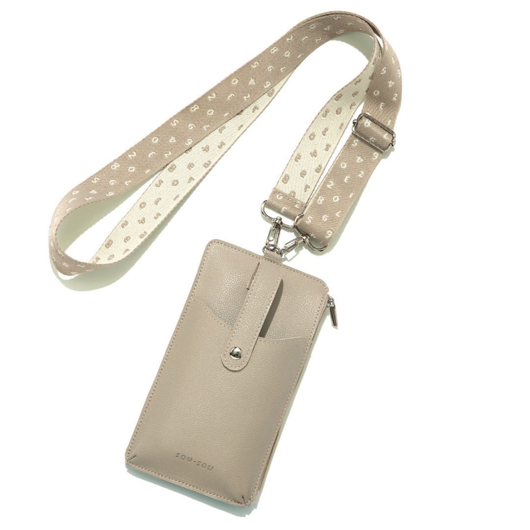 幅広ストラップに「SO-SU-U(ソスウ)」柄が織り込まれたスマホポシェットです。隠しポケット付きで小物収納も◎。