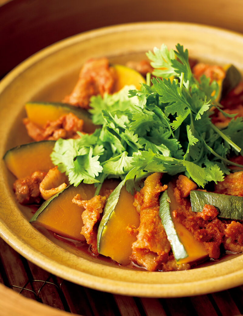 耐熱皿にかぼちゃ、豚肉を交互に並べ、蒸気の立った蒸し器に入れて15分ほど蒸す。蒸し上がったら、お好みでパクチーを添える。