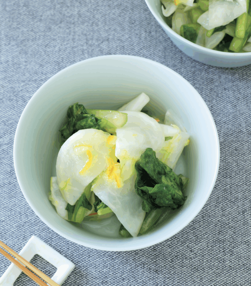 かぶは葉の根元を1㎝残して切り落とし、皮ごと薄切りに、葉はざく切りにして塩(分量外)をふり、しんなりしてきたら水気を切る。