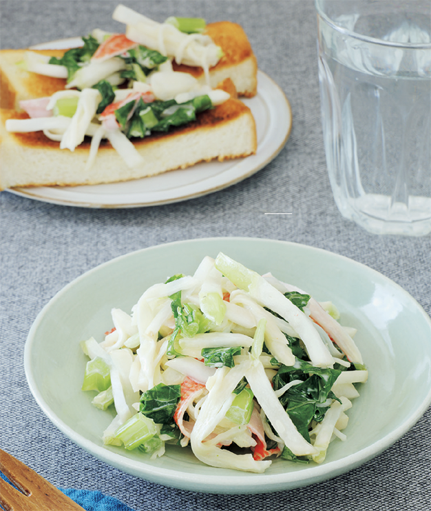 ボウルに1、手で割いたかにかま、Aを入れてよく混ぜる。お好みでトーストにのせても。