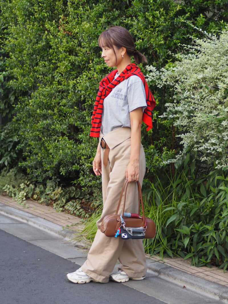 一見ベーシックなTシャツ×チノパンの組み合わせを、挿し色や小物使いで今っぽく仕上げたカジュアルスタイル。「トップスもパンツもすごく気に入っていて、2色買いしました。基本パンツスタイルが多く、ハイウエストのアイテムが好みです」。赤×黒ボーダーのカーディガンを肩にかけ、目線を上に持ってくるスタイリング術もお見事!