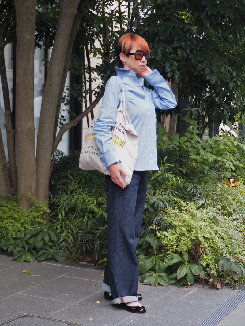 爽やかなブルーのシャツに濃紺デニムを合わせた、シンプルながらも品を感じる装い。カジュアルになりがちなデニムには、エナメルのバレエシューズで女性らしさをプラス。