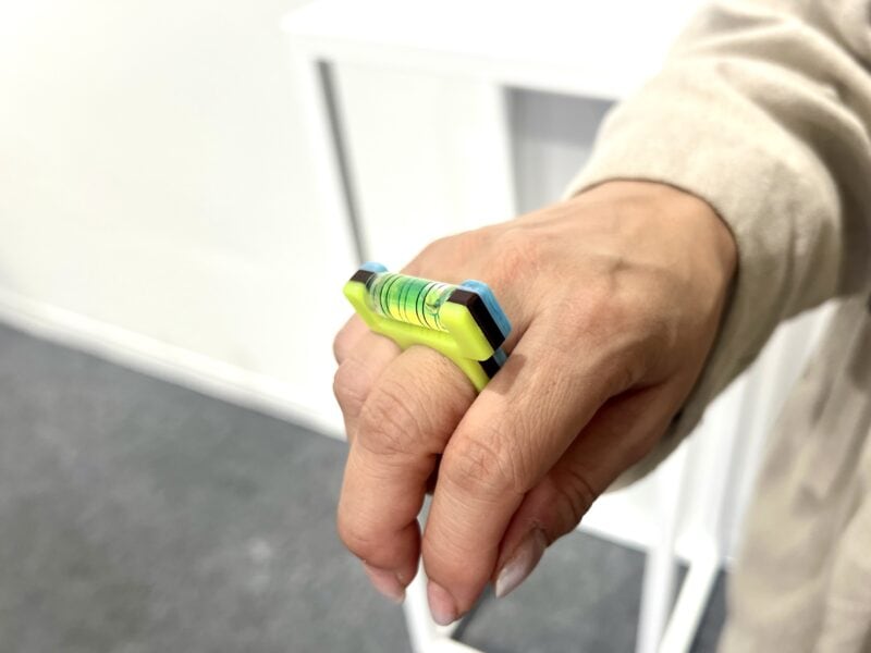 ミヤケマイ×TOKYO ACRYLコラボの水平器リング「曲がったことはキライ」。「アクリルブランドとコラボレートして作っていただいたオリジナルです」。水平器は、工事やDIYなどの際に欠かせない、水平・垂直・45°などを測定するツール。三層に貼り合わせたアクリルのカラーがポップ!