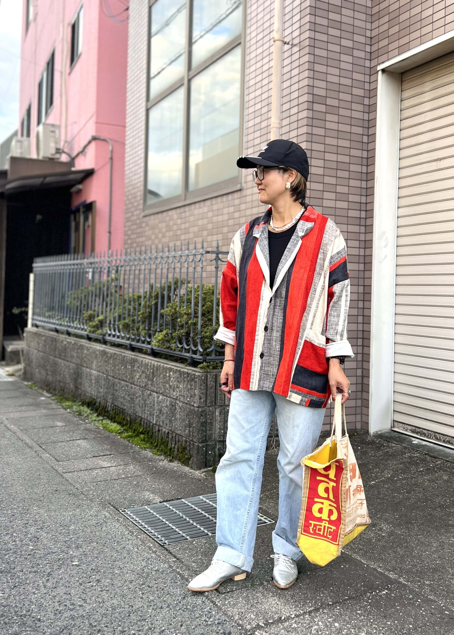 自身が手がける「Laugh(ラフ)」のアウター。ざっくりした素材感と、赤のマルチストライプがお気に入り。「赤に抵抗がある方もいらっしゃると思いますが、古着デニムやレースのスカートを合わせると、大人でも着こなしやすいスタイルに仕上がりますよ」。