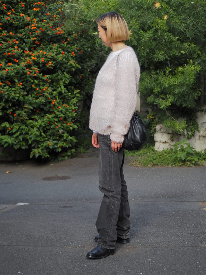 やわらかな質感のモヘアニットにグレイッシュなデニムを合わせた、シンプルながら品のあるスタイル。白に近い淡いピンクベージュが顔まわりをパッと明るくし、やさしい印象をプラス。ブラックのレザー小物で全体を引き締めるバランスのよさが◎。