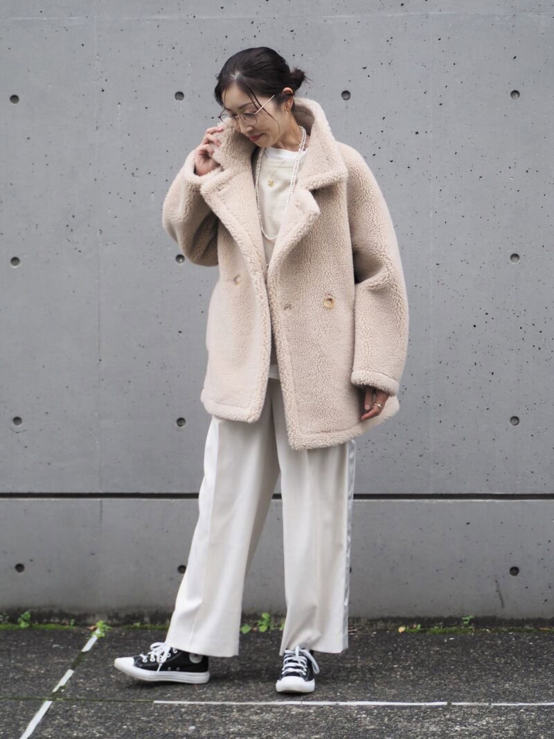 「冬はホワイト系のアイテムが気になります」と、畑山さん。ベーシックなカラーでシンプルにまとめつつ、素材で季節感を演出するワントーンコーディネートが大得意! 華やかなボアコートにスポーティなラインパンツやスニーカーを合わせるバランス感覚も◎。