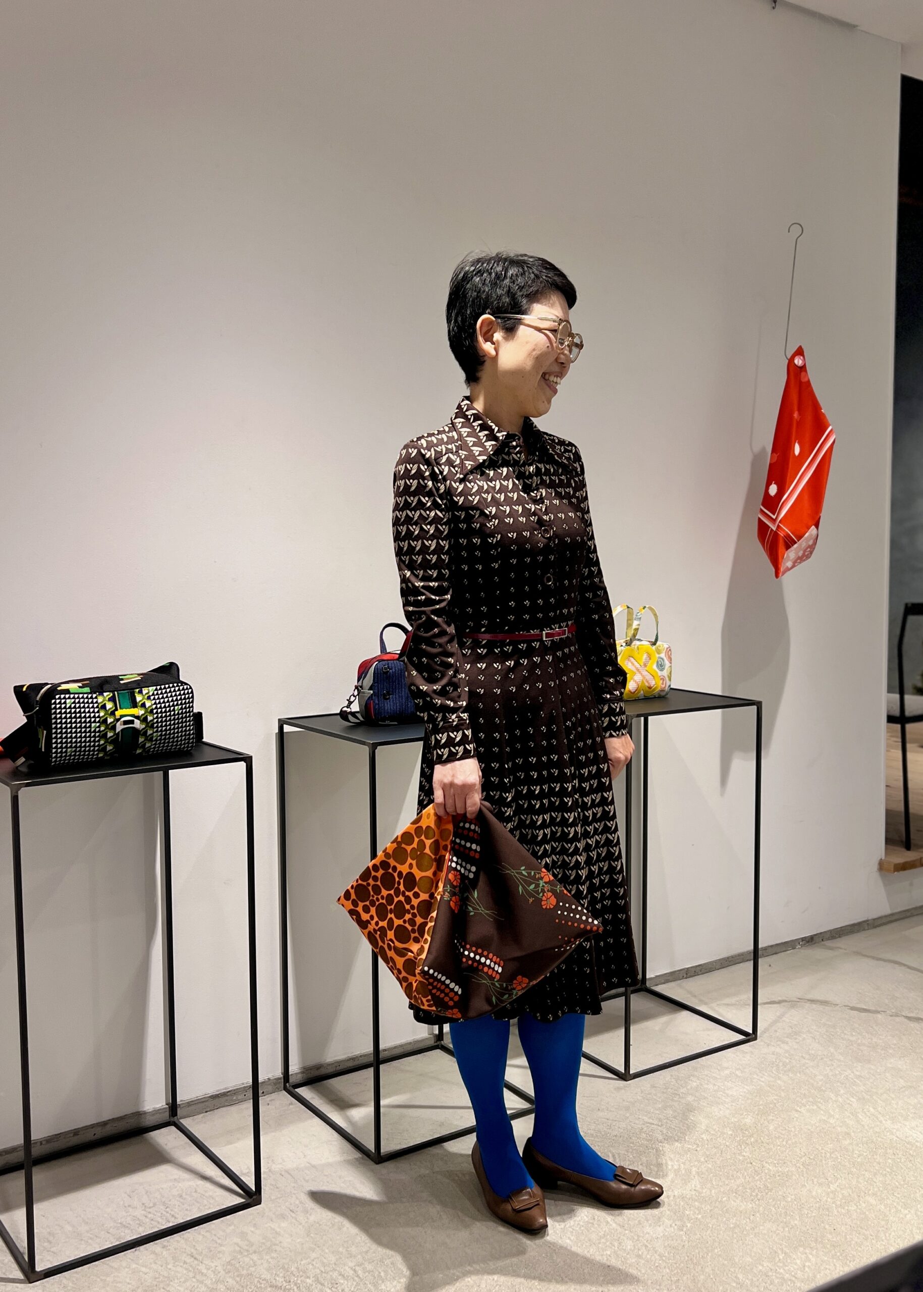 6年ぶりの個展開催中の布構成家、niwa yumikoさんをキャッチ。ノスタルジックでグラフィカルなヴィンテージのワンピースを、マイサイズで品よく着こなすのがniwaさんらしいスタイル。「ワンピースがダークなブラウンなので、赤いベルトとタイツで少し明るい印象になるようにコーディネートしました」。