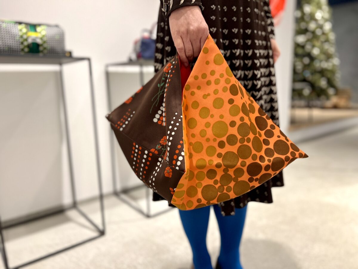 バッグは、niwa yumikoさん自身の作品。「正三角形6つからなる平行四辺形を立体にしたもので、手に持つとテトラのような形になるのがお気に入りです」。持ち手のくるみボタンまでかわいい!