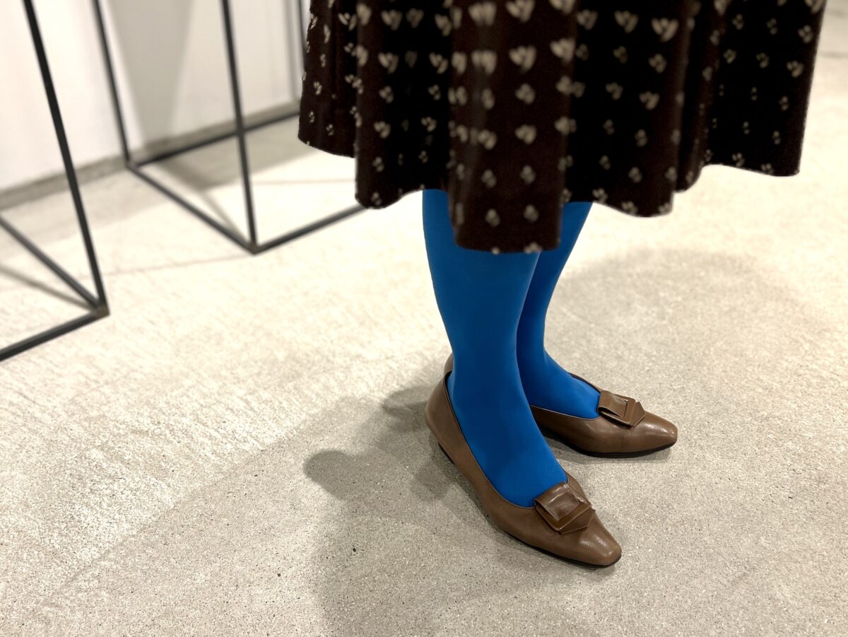 ターコイズのカラータイツで遊んで、ぐっと高まるおしゃれ感。ご親族の形見だというパンプスも、丁寧に手入れされていて気持ちがいい。