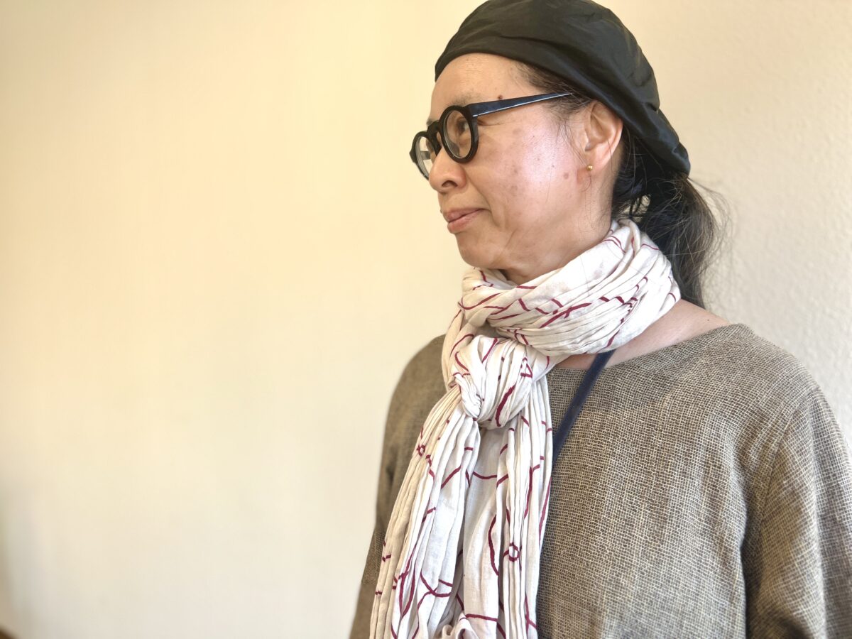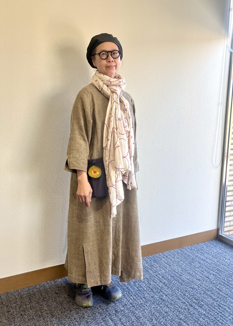 ナチュラルでアジアンなシンプルスタイルが素敵なモザイクアーティストの外村まゆみさん。この日は京都・西陣に店舗を構える「うさと」のワンピースに、たっぷりボリュームのあるストールをプラス。「大きめのストールや古布、アジアの織物が好きで、その日の気分で肩にかけたり巻いたりしています」。アクセサリーの代わりはメガネと帽子。愛嬌のある黒縁の丸メガネは、故・坂本龍一さんが愛用していたことでも知られる「ジャック・デュラン」。ベレー帽は京都の「A-Na(アーナ)」。