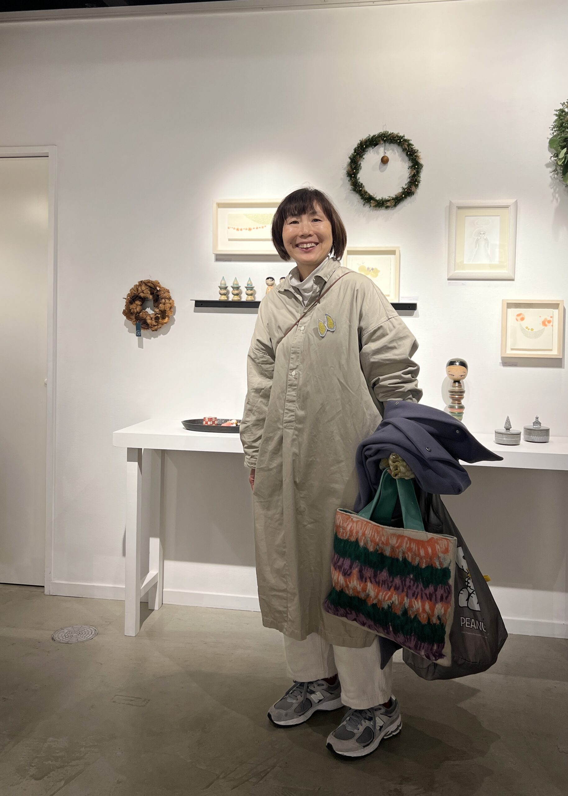 お気に入りの京都ブランド「ジャンボリー」が出店しているグループ展を訪れていた中西さん。20代〜30代はツモリチサトが好きで、今でも大切に着ているコートがあるのだそう。「50代になり、一目惚れはあまりしなくなったかな。今、大切着ている洋服に合う服を少しずつ足していくという感覚です」。この日も「このカーディンガンに合わせるボトムを」と、手持ちのニットを持参。お買い物上手のコツですね。