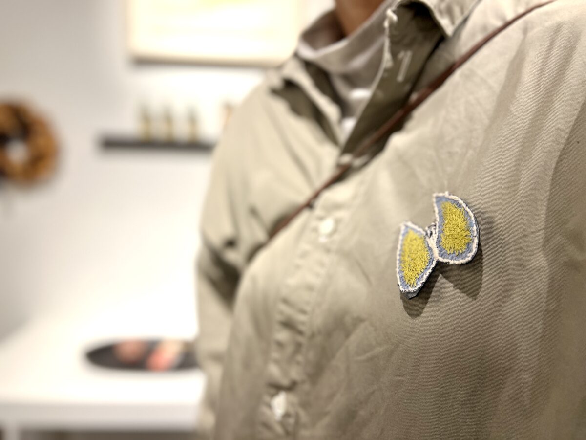 「ミディウミ」のシャツワンピースの胸元には、おおらかなニュアンスのある刺繍ブローチ。「支援職についているのもあり、障害者さんの作ったものを買い求める機会も多いです。とっても気に入っています」。