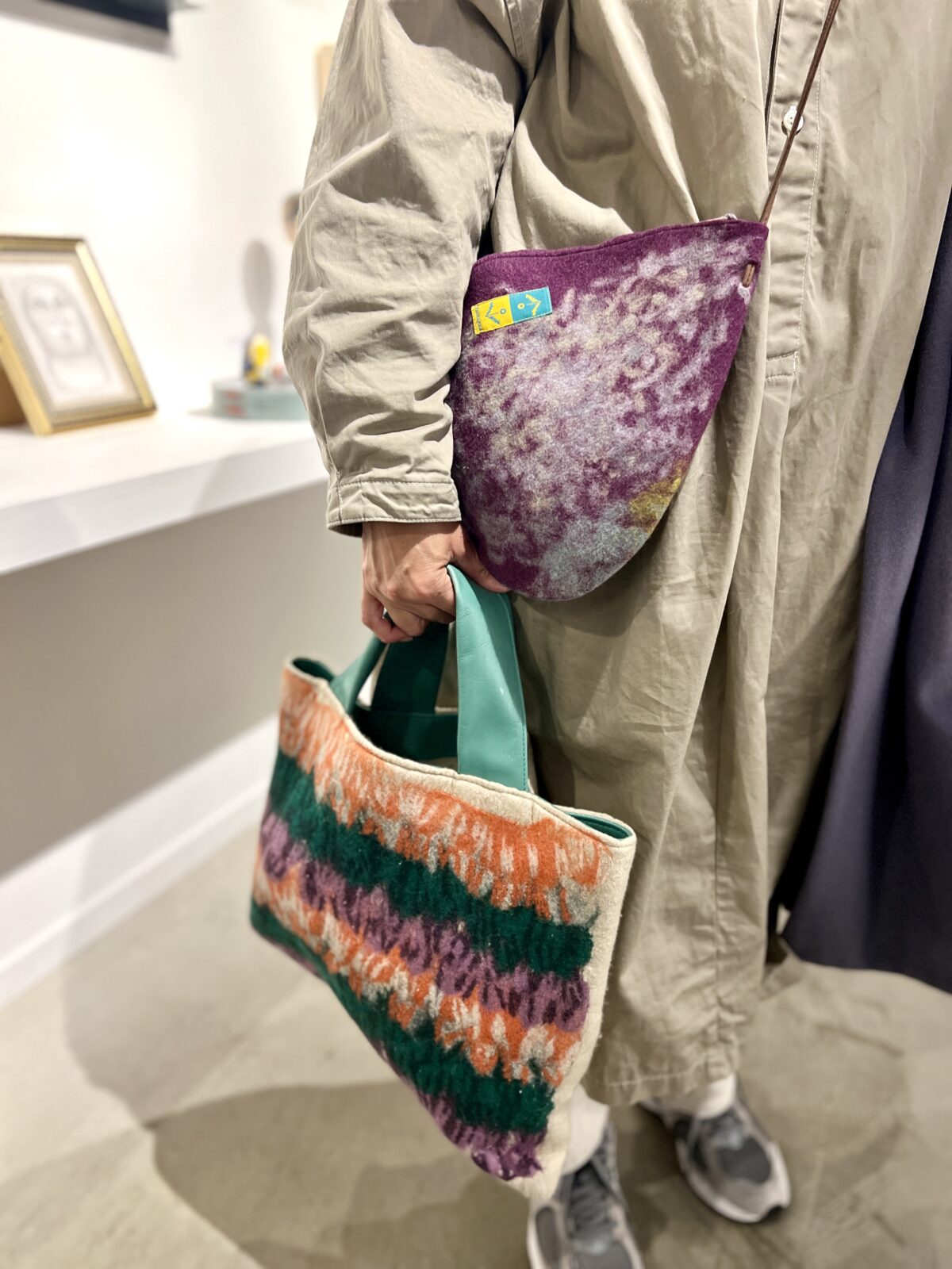 グレージュのワントーンコーデに、パッとした明るさと温かさを加えているのが、2つ持ちしたバッグ。「どちらも、神戸の障害者支援施設で作られていて、とっても気に入っているんです」。ブランド名は、フィンランド語で「たんぽぽ」を表す「Voikukka」。鮮やかな色使いの羊毛フェルトの温かみが、中西さんの優しいお人柄にぴったりです。