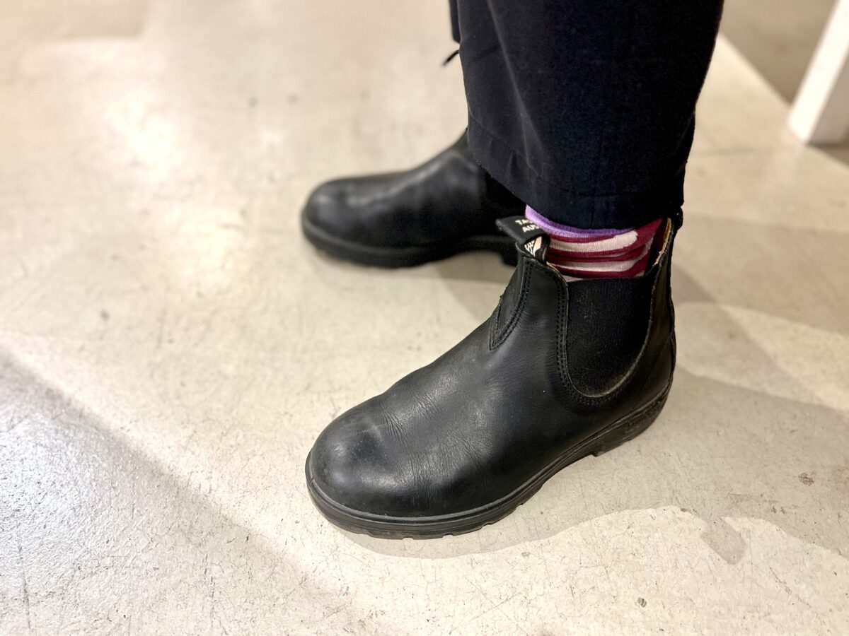 オーストラリアのタスマニア島で生まれた「BLUNDSTONE(ブランドストーン)」を代表する定番サイドゴアブーツ。「雨の日にも活躍するので、とても重宝しています」。チラッと見えるボーダーの靴下もおしゃれ。